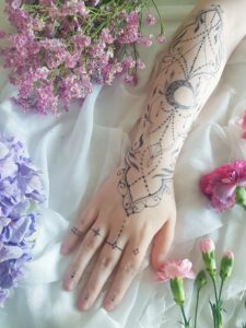 Jeśli nie interesują Cię wzory typowo “hennowe”, a na przykład przymierzasz się do prawdziwego tatuażu – henną lub jaguą możemy zrobić taki próbny tatuaż! Podeślij swój projekt, ocenię czy podejmę się wykonania hennowej/jaguowej kopii i wycenię go indywidualnie.